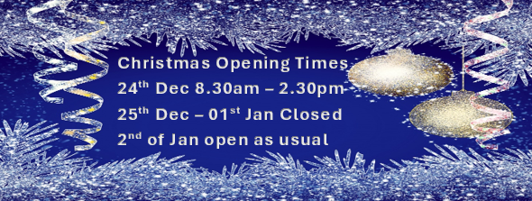 Back to News Home News Christmas Opening Hours Christmas Opening Hours 13th December 2024 Merry Christmas and Happy New Year to all.